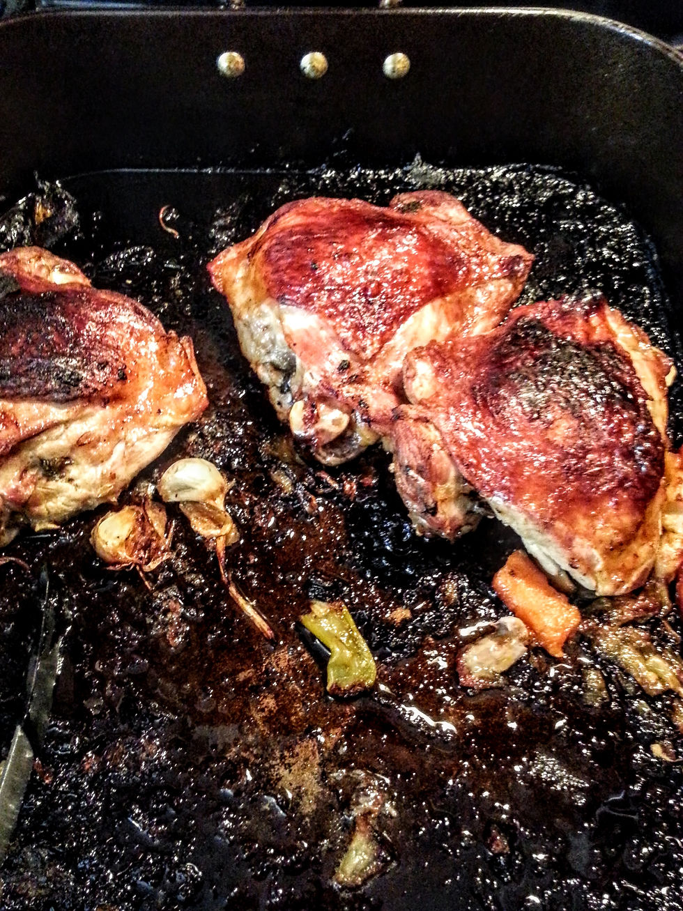 6 turkey thighs (will do triple duty to make taquitos – see separate blog) 5 carrots coarsely chopped 1 head garlic cut in half 2 onions peeled and coarsely chopped 1 cup dry white wine 12 cups low sodium turkey stock Butter and flour as needed for the roux Marsala wine